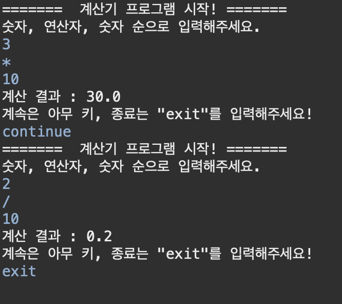 3. 계산기 프로그램을 시작하면 , 사용자가 "exit"라는 단어를 입력할 때까지 프로그램을 계속 돌아가게끔 do-while 반복문을 활용하겠습니다.