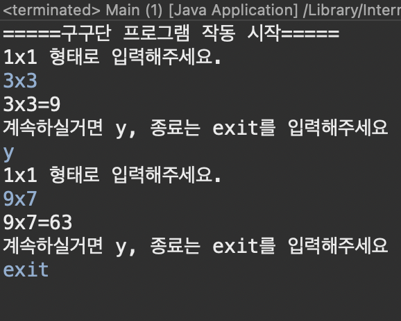 System.out.println("=====๊ตฌ๊ตฌ๋จ ํ๋ก๊ทธ๋จ ์๋ ์์=====");