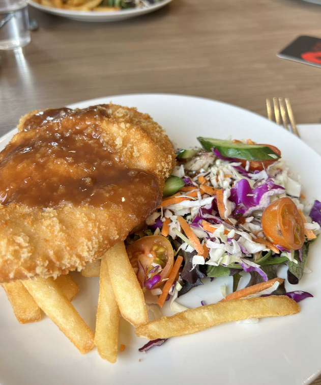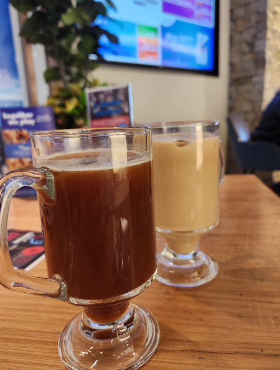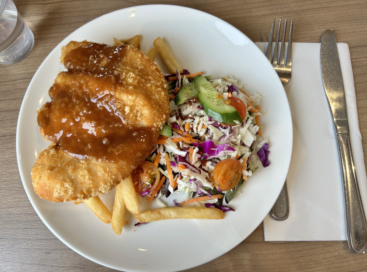 ๊ฑด๋ฌผ ์์ ์นดํ๋ ์๊ณ , ์์ฒญ ๋์๋ค. ์ฌ์ ๋กญ๊ฒ ๋ฐฅ ๋จน๊ณ ์ปคํผ ํ์ ์ฌ ๋จน์๋ค.